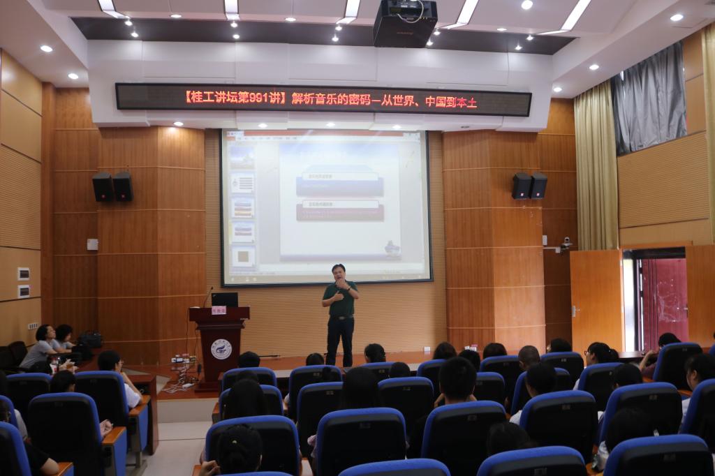 6月4日下午,桂林师专音乐系副教授柴伦党在雁山校区萃华楼报告厅做了题为《解读音乐语言的密码---从外国、中国至桂林本土》的专题讲座,来自各院系的近200名师生到场聆听。