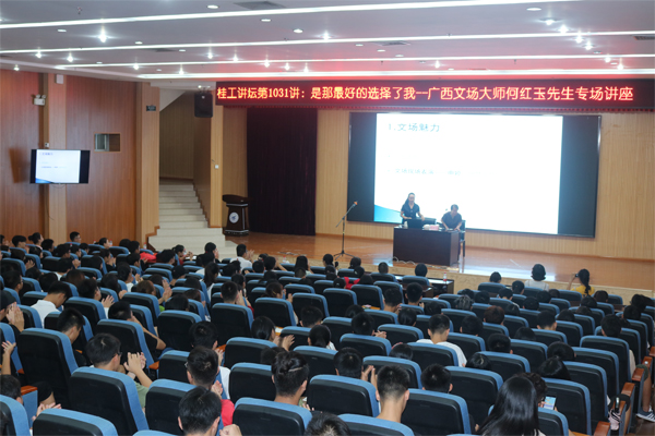 何红玉先生精神矍铄,气质优雅,以"是那最好的选择了我"为题,向在座师生介绍了自己与母校的渊源、与文场结缘的不寻常从艺之路、感念至深的师生情缘、授徒德艺双馨的高要求以及广西文场的历史渊源等内容。她以饱满的热情和对传统文化艺术的痴爱,且讲且唱,并通过自己的代表作《骂玉郎》等经典传统唱段和曲目,讲解了广西文场的音乐特质和曲本特征。广西文场是流行于广西桂北官话地区的传统清唱艺术,音乐委婉缠绵,柔和抒情,是广西最有代表性和最具影响的传统曲艺形式。广西文场是广西珍贵的非物质文化遗产,2006年列入广西非物质文化遗产名录。如今,广西文场伴随着美丽的桂林山水,以传统的艺术魅力、新颖的内容以及多样的表现手段,展现在文艺舞台上。最后,何先生以唐代著名诗人韩愈的名句“书山有路勤为径,学海无涯苦作舟”,与在场学子们共勉。
