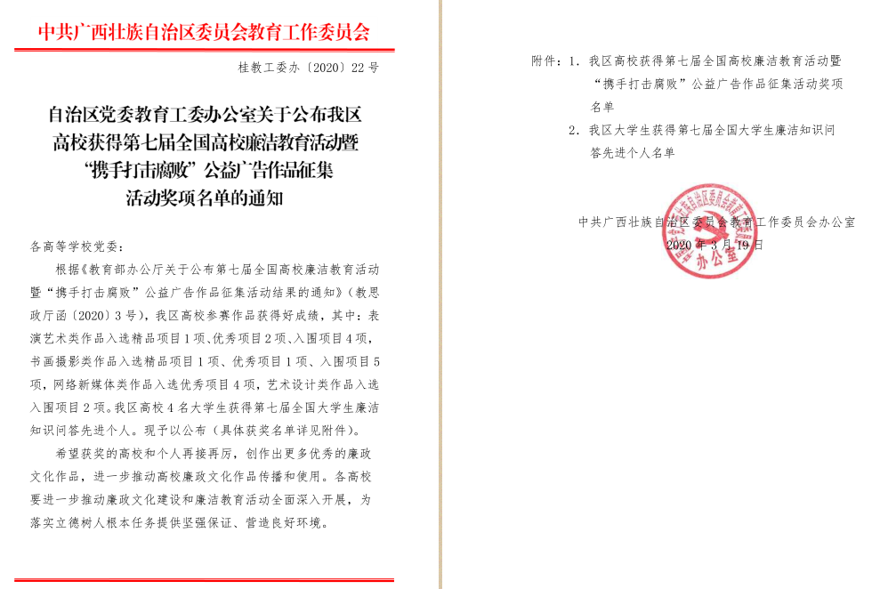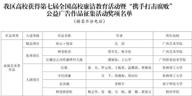 近日,教育部思想政治工作司发布的《教育部办公厅关于公布第七届全国高校廉洁教育活动暨“携手打击腐败”公益广告作品征集活动结果的通知》(教思政厅函〔2020〕3号),古天乐代言太阳集团网址推送的表演艺术作品《守住清廉》获全国高校廉洁教育活动表演艺术类作品入围奖项1项(全区此类获奖7项)。