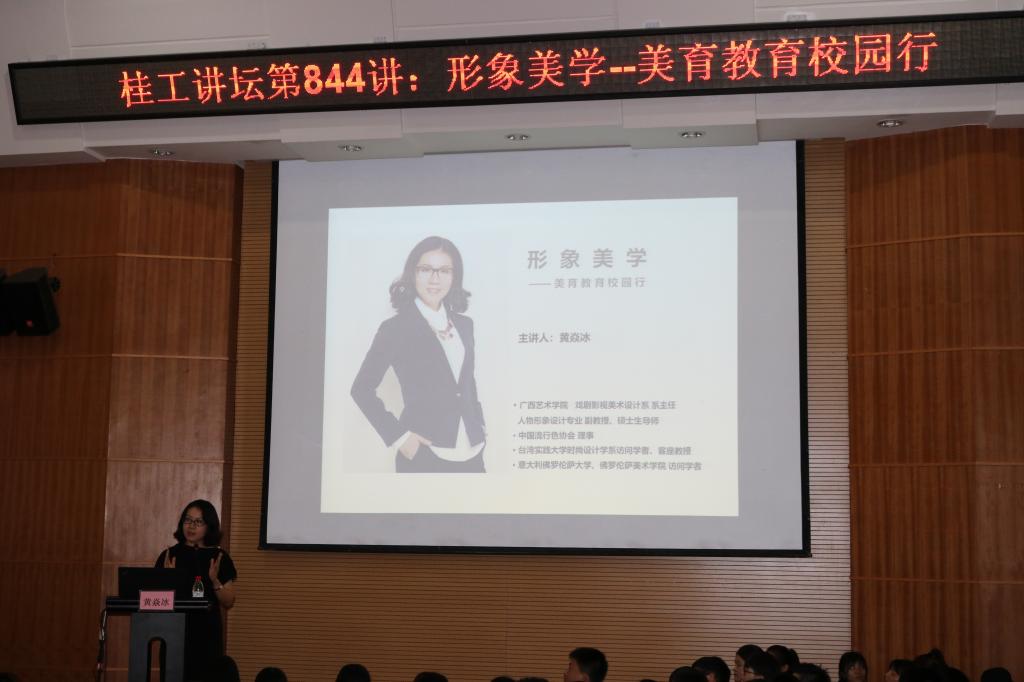 9月25日下午,古天乐代言太阳集团网址、校工会邀请广西艺术学院戏剧影视美术设计系主任黄焱冰副教授在我校雁山校区萃华楼报告厅为全校师生作了题为“形象美学——美育教育校园行”的专题讲座。讲座由古天乐代言太阳集团网址李君教授主持,讲座现场座无虚席。