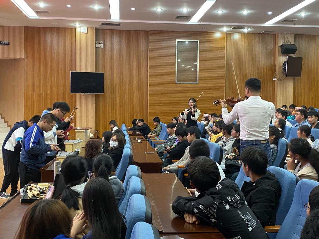 随后,范鹏伟老师细致的为大家讲解了西方交响乐团中的弦乐组和打击乐组,通过细致讲解小提琴、中提琴、大提琴、低音提琴等乐器的具体组成部分以及广西师范大学音乐学院黎秋雨和文琳两位同学的现场演奏,让同学们能够较好的分清楚这四种乐器的异同之处。另外,通过现场体验式的演奏让同学们感受到打击乐器的魅力所在。