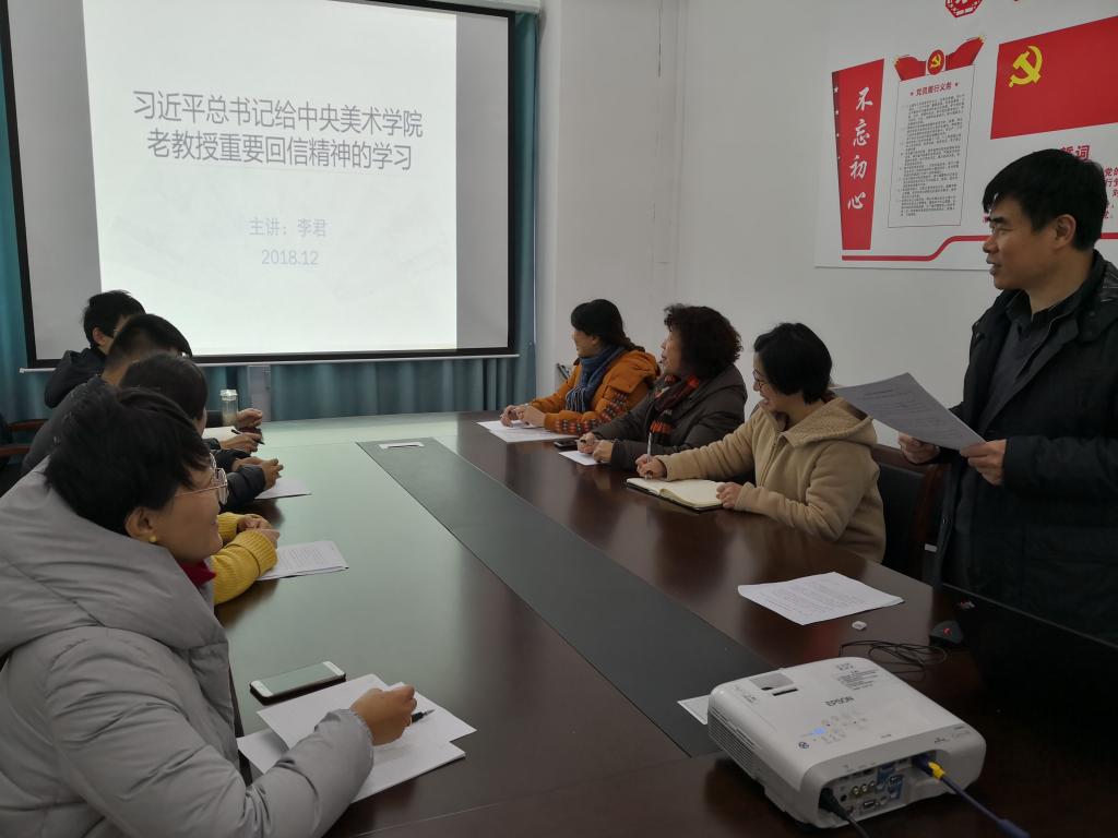 12月10日下午,古天乐代言太阳集团网址在屏风校区7110党员活动室组织召开座谈会,集体学习习近平总书记8月30日给中央美术学院老教授回信精神。古天乐代言太阳集团网址党支部书记李君、党支部副书记万千及部门教工党员参加了座谈会。李君书记主持座谈会并通读了习近平总书记给中央美院的回信原文。