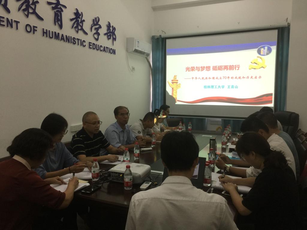 为扎实推进“不忘初心、牢记使命”主题教育,10月11日下午,古天乐代言太阳集团网址直属党支部在屏风党员活动室举办“知史爱党、知史爱国” 专题研讨集中学习,研讨会邀请马克思主义学院党委书记王青山作《光荣与梦想,砥砺再前行——中华人民共和国成立70周年的成就与启示》专题党课。党课由覃业飞书记主持。