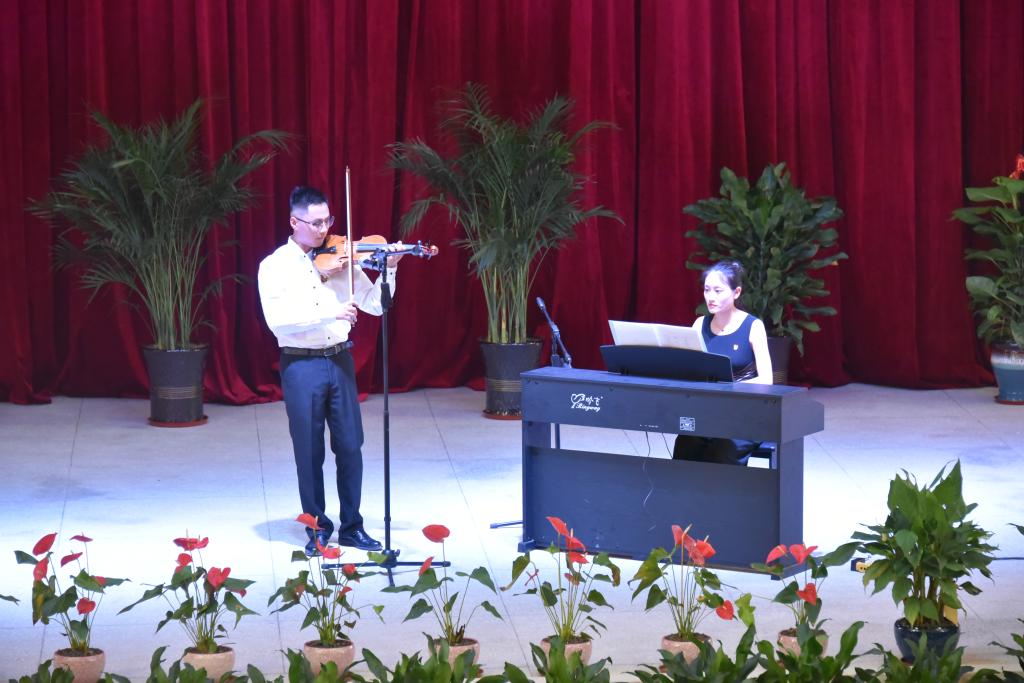 最后,部门为与会教师呈现了一台高质量文艺汇演。其中原创舞蹈《肩头》,以第一书记故事背景为依托,演绎发生在扶贫路上的父女情深;原创歌曲《全民脱贫奔小康》歌颂了用智慧和汗水凝聚而成的全面小康的美好年华;歌曲《不忘初心》唱出了万水千山,最美的中国道路;朗诵《脱贫路上,一个也不能少》,深情款款并斩钉截铁地道出了全面小康的路上一个也不能少的信念与决心……另外戏曲演唱《甘露寺:劝千岁》展示了戏曲艺术的无穷魅力;品味精致和雅趣、曼妙的小提琴钢琴协奏曲《花儿为什么这样红》和旋律流畅、优美动听的葫芦丝名曲《军港之夜》引领在座的教师一探乐器之妙、一品音乐之美,给人以心灵宽慰,体验乐器意义所在。