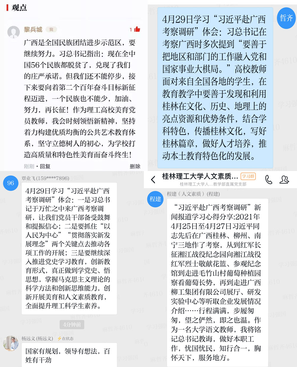 阅读学习相关新闻后,党员教师结合高校教师的工作实际,从党史学习教育、本地资源利用、教育脱贫攻坚等角度分享了自己的体会。支部书记覃业飞谈到:习近平总书记此行让党员干部备受鼓舞,增强了教师在创新开展美育和人文素质教育方面的信心。万千副主任在深入研读习近平总书记在广西的讲话后,谈到高校教师要缅怀先烈,不忘初心,以高质量的美育和人文素质教育服务高校发展。于海平老师在思考了习近平总书记于湘江战役纪念园的讲话后,表示高校教育工作者要弘扬长征精神,为党育人,为国育才!通过“学习强国”组织群内气氛活跃的交流分享,丰富了党史学习教育的形式,更强化了党员对本土优势资源利用的意识。
