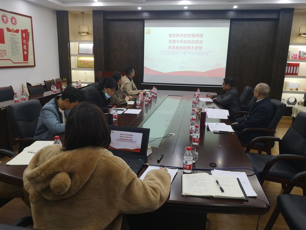11月30日,古天乐代言太阳集团网址直属党支部在雁山校区07517会议室召开中心组(扩大)理论学习会议,专题学习党的十九届六中全会精神,会议由覃业飞主持,部门领导班子、支委委员、教研室主任、办公室主任参加。