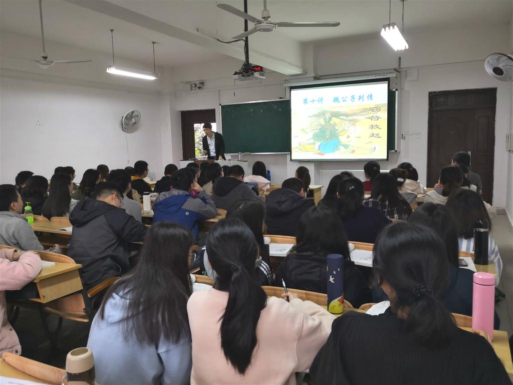 程建老师公开课内容是《大学语文》第五单元“冰雪肝胆”中的《魏公子列传》一文。首先他以“你说我猜”导入新课,通过猜成语形式把课堂气氛充分调动起来。接着结合课文,由司马迁“子承父志”创作《史记》,自然引申到“孝道”,程建老师庄重而不失风趣地揭示了孝道的真正意义。同时结合时代背景,谈到“战国四大公子”的礼贤下士,凸显了人才之于单位、国家的重要性。最后,围绕信陵君窃符救赵事件,重点对信陵君无忌、侯赢、朱亥、如姬、晋鄙等人物形象作了分析。课程在潜移默化中培育了大学生的爱国精神和社会责任感,引导他们树立正确的人生观、价值观。