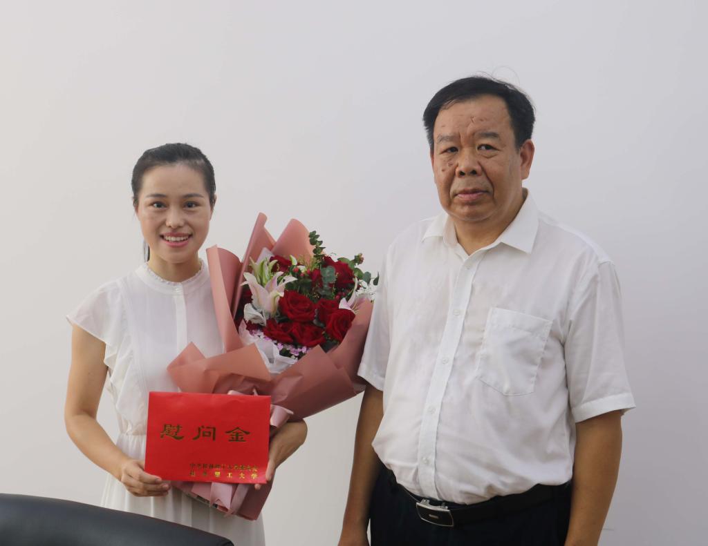梁副校长为周治红送上鲜花和慰问金,感谢她为学校建设和部门发展做出的积极贡献。周治红老师感谢学校的关怀,表示自己一定不负厚望,努力做出新的成绩。