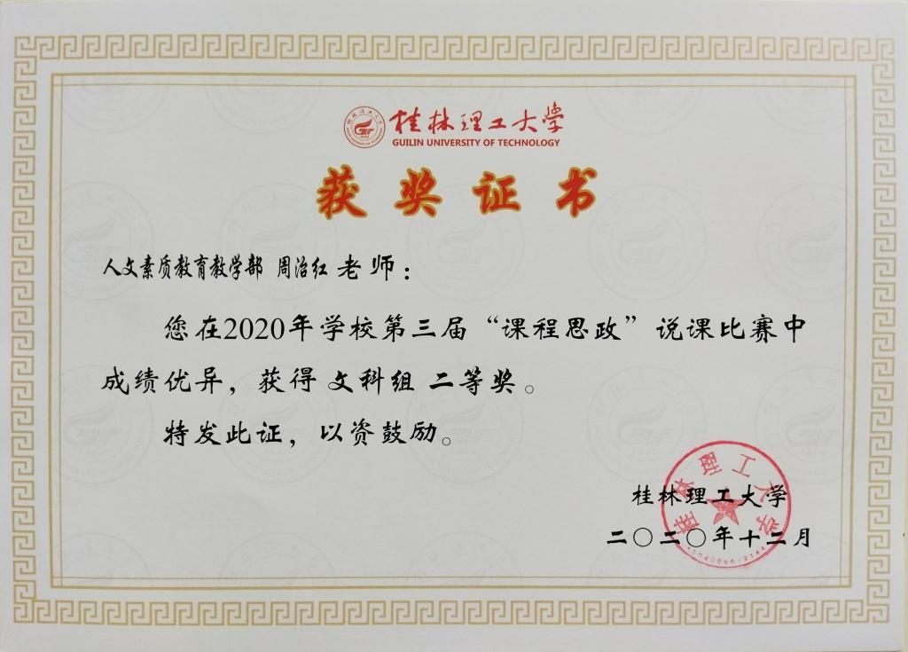 周治红老师课程思政说课比赛获奖证书