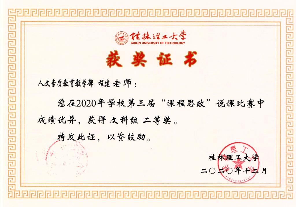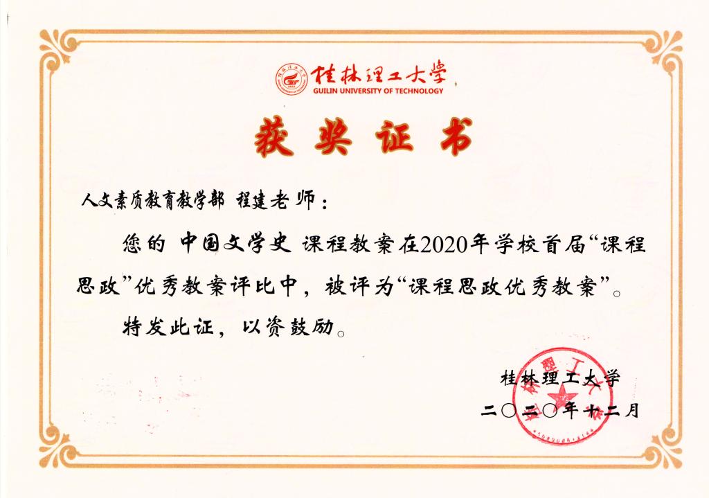 程建老师课程思政优秀教案获奖证书