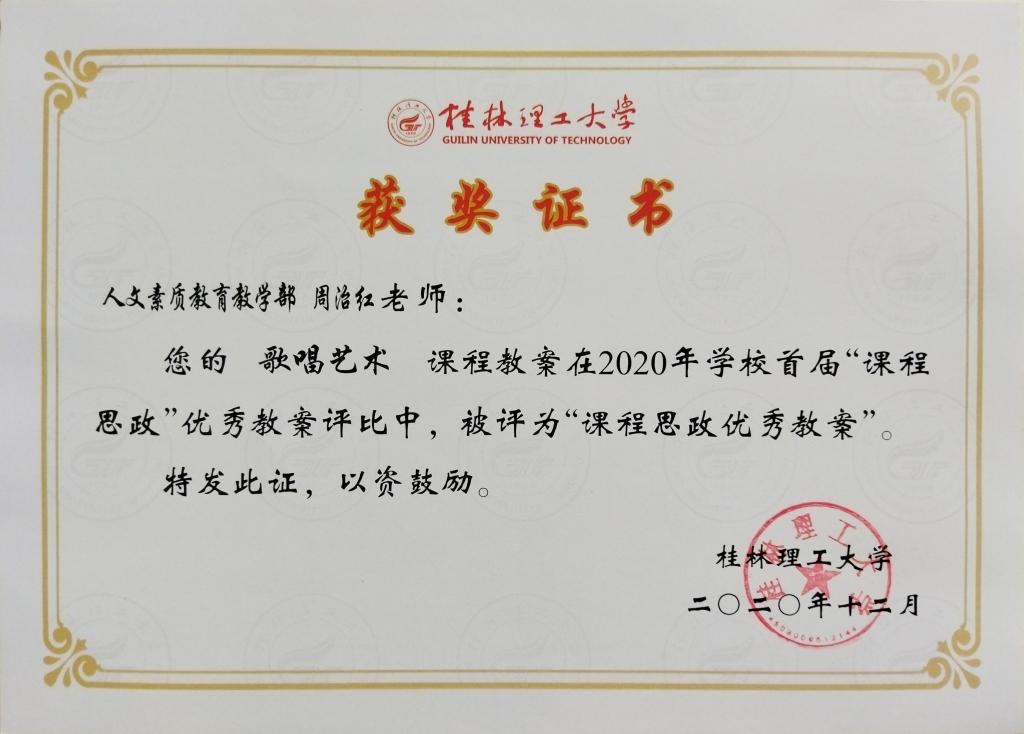 周治红老师课程思政优秀教案获奖证书