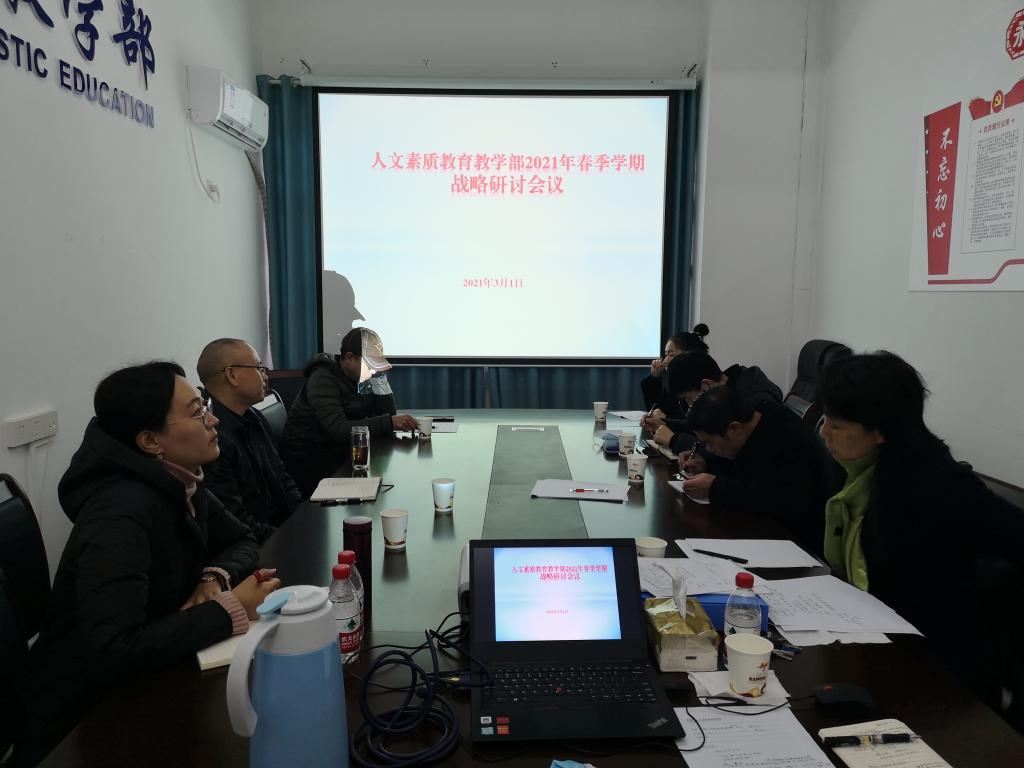 会上,经过前期讨论、酝酿,对2021年部门重点业务工作目标初稿逐项讨论,最终形成定稿,为部门2021年发展提供了方向。随后,与会人员就部门十四五期间的发展规划开展战略研讨。覃主任指出,全体教师要转变观念、强化部门意识、从教学、科研、党建、校园文化建设等四个方面着手,实施年终绩效改革、校内课外实践体系建设、人文素质教育微视频制作等具体措施,结合实际,逐步推进,完善人文素质教育体系。一是要通过年终绩效分配方案改革等一系列措施,完善激励机制,激发全体教师干事创业的积极性;二是要根据理工科院校实际,大力推进有特色的《大学语文》一流课程建设和公共艺术课程结构调整,通过内容、方法等方面的改革,形成具有校本特色、高质量的人文素质教育课程体系;三是要在科研上初步形成团队,力争在国家级科研项目上取得突破;四是要加强青年教师培养和兼职教师队伍建设;五是要在校园文化建设中将开放日与“文化广场”活动合二为一,形成课外实践特色品牌;等等。