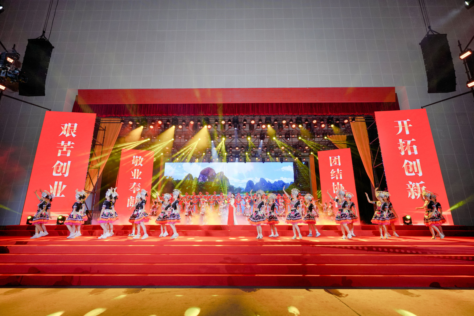 校领导邓军、王敦球、吴志强、韦学敏、王磊、黎贞崇、罗盛锋、曾繁荣,桂林市各兄弟高校及陆军特种作战学院、中国科学院广西植物研究所,桂林市委宣传部、市委统战部、桂林市雁山区等单位领导,学校离退休老领导、老同志代表,学校自治区级以上优秀教师、模范教师代表,以及校友代表、师生代表共3000余人现场观看演出。演出通过线上形式同步进行高清视频直播和图片直播,约4万人次同时观看演出盛况,点赞量超35万次。