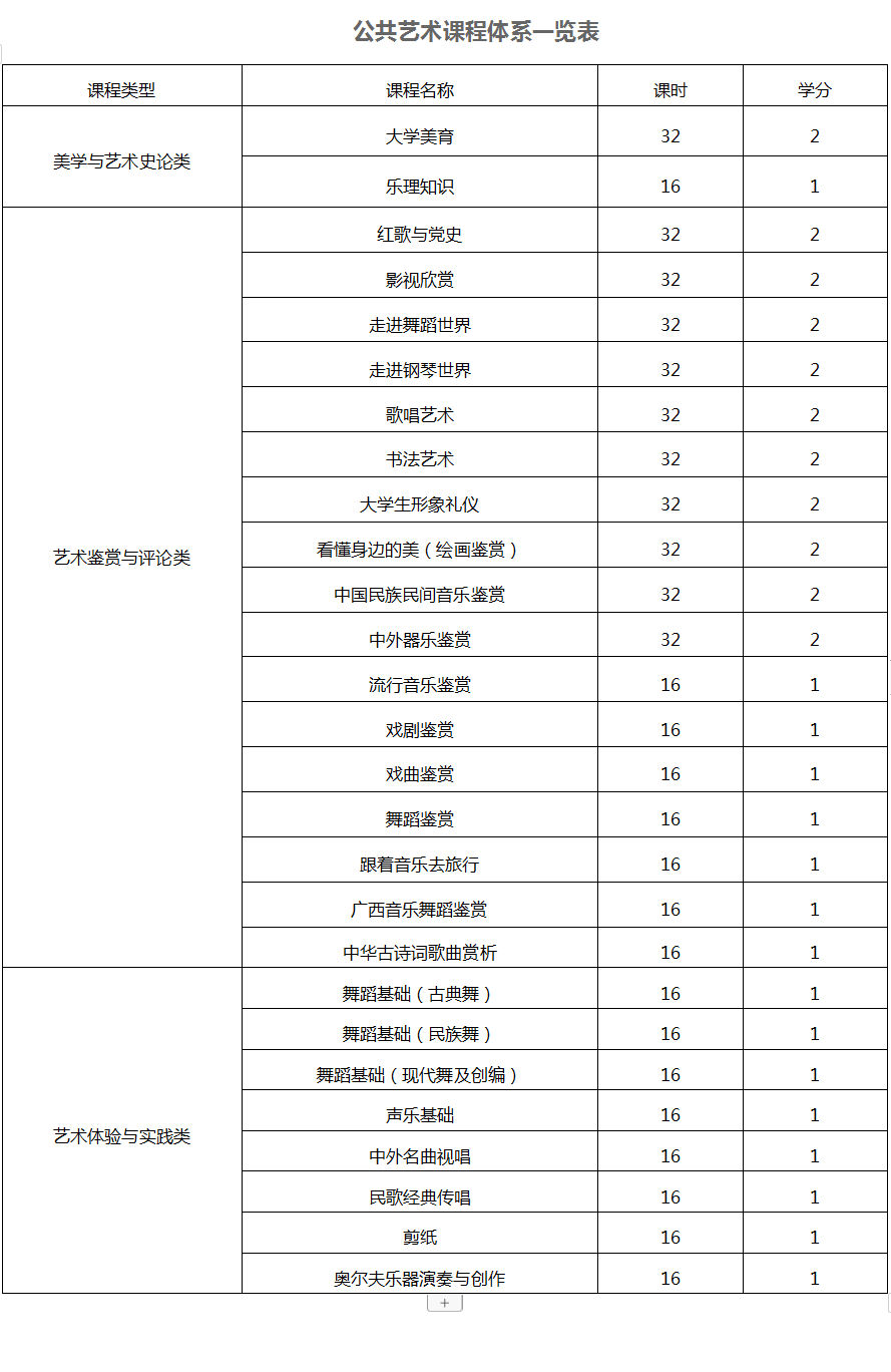 我校公共艺术课程内容设置是基于2022年教育部办公厅关于印发《高等学校公共艺术课程指导纲要》文件指导,结合我校实际,依托地域优势,构建出以大学美育课程为核心,涵盖音乐、舞蹈、器乐、戏剧、影视、绘画、书法、剪纸等多元艺术学科的课程体系,严格按照《纲要》规定,划分为以《大学美育》为代表的美育与艺术史论类,以《书法艺术》《广西音乐舞蹈鉴赏》为代表的艺术鉴赏与评论类以及以《中外名曲视唱》《剪纸》为代表的艺术体验与实践类三大课程类型。(详见附件1)